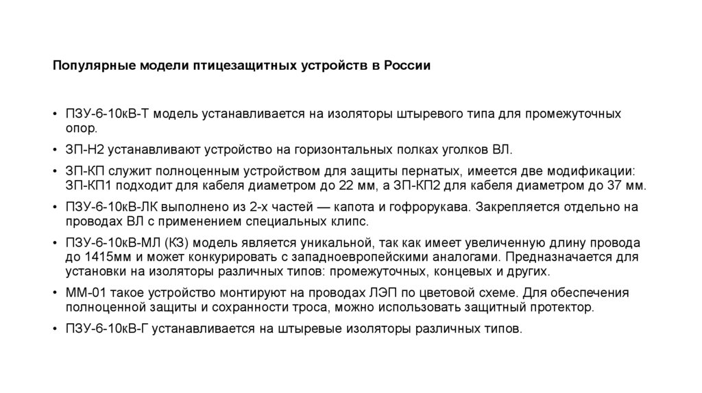 Популярные модели птицезащитных устройств в России• ПЗУ-6-10кВ-Т модель устанавливается на изоляторы штыревого типа для промежуточных