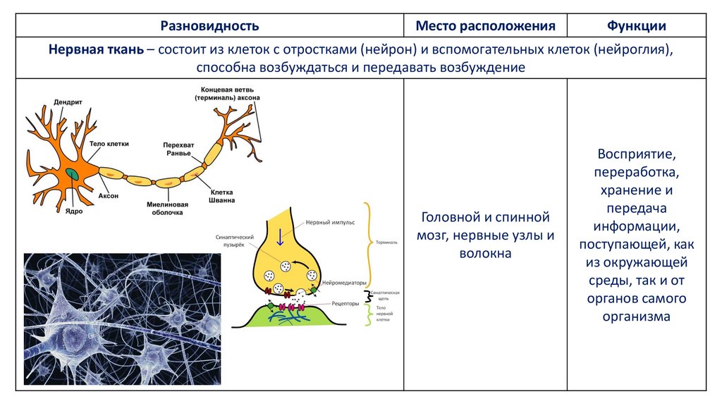 Нервная ткань – состоит из клеток с отростками (нейрон) и вспомогательных клеток (нейроглия),