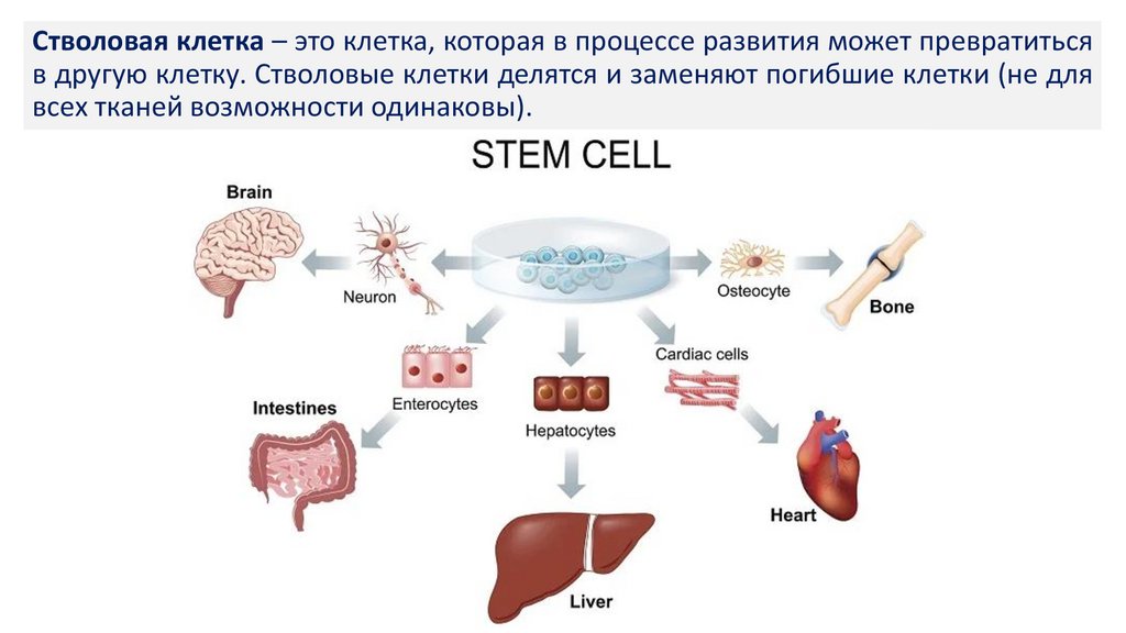 Стволовая клетка – это клетка, которая в процессе развития может превратитьсяв другую клетку. Стволовые клетки делятся и заменяют погибшие клетки (не для