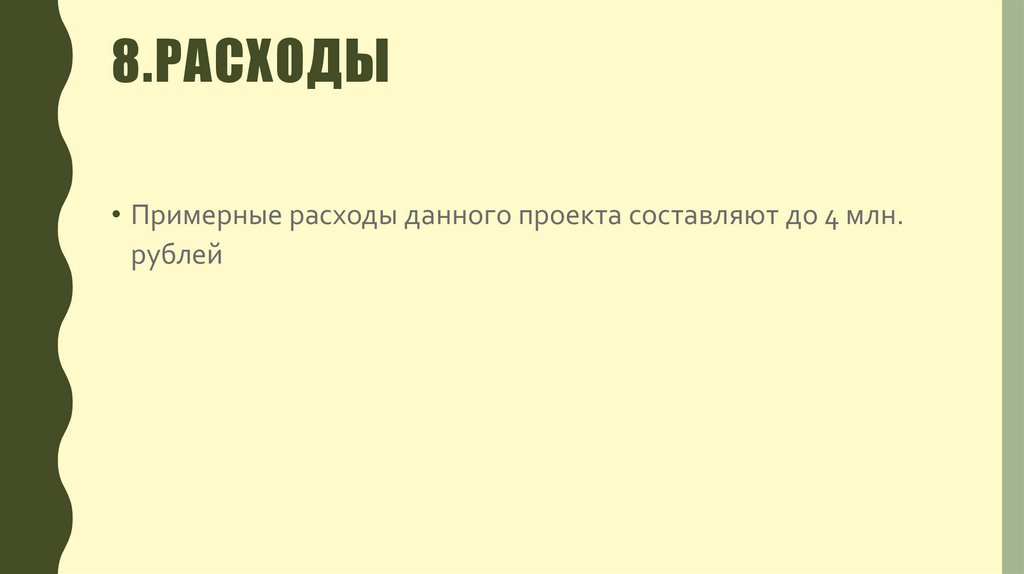 8.РАСХОДЫ• Примерные расходы данного проекта составляют до 4 млн.