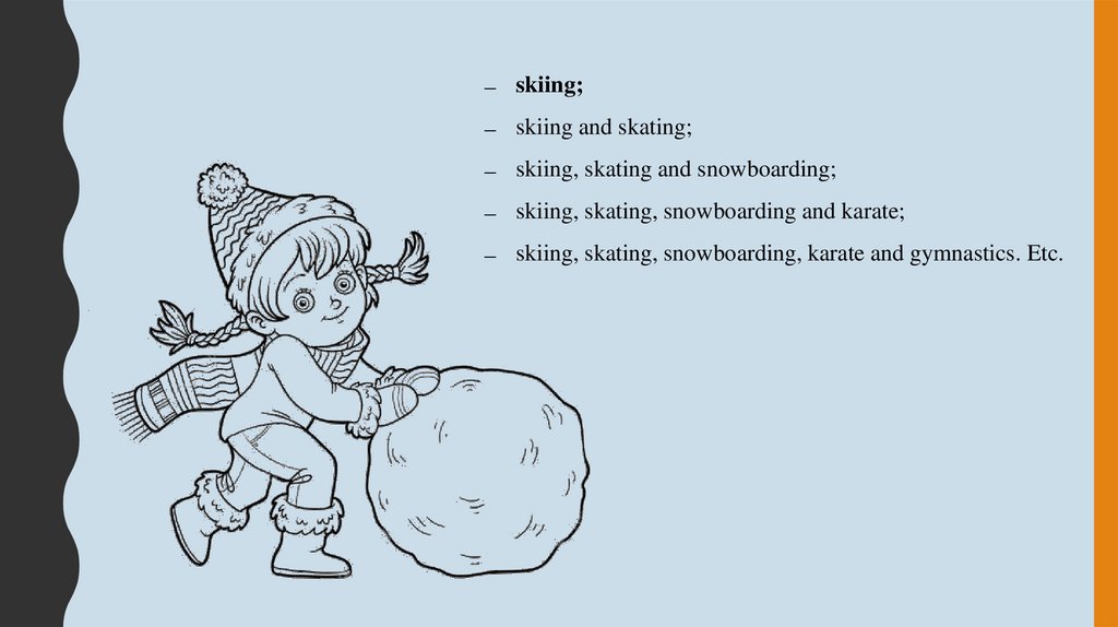 skiing, skating, snowboarding, karate and gymnastics. Etc.