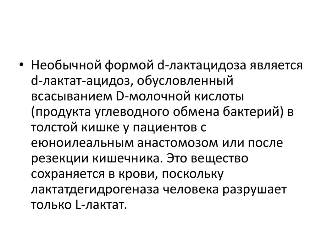 • Необычной формой d-лактацидоза являетсяd-лактат-ацидоз, обусловленный