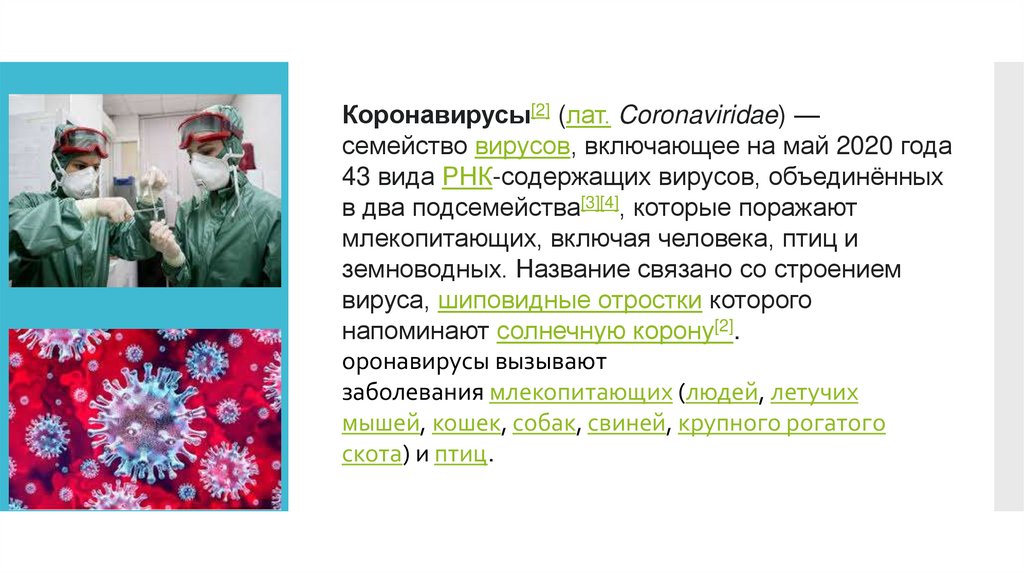 Коронавирусы[2] (лат. Coronaviridae) —семейство вирусов, включающее на май 2020 года