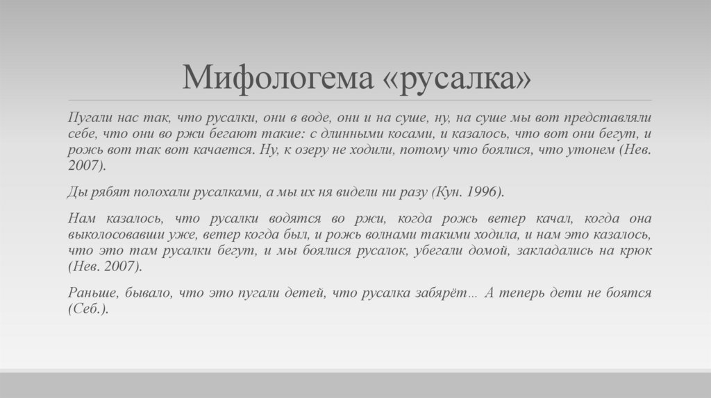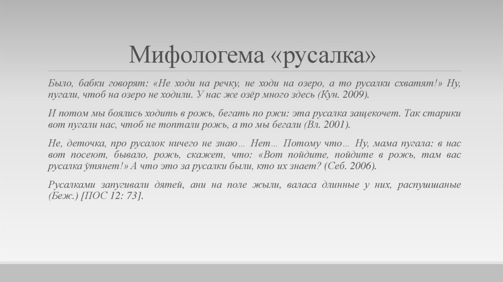 Мифологема «русалка»Было, бабки говорят: «Не ходи на речку, не ходи на озеро, а то русалки схватят!» Ну,