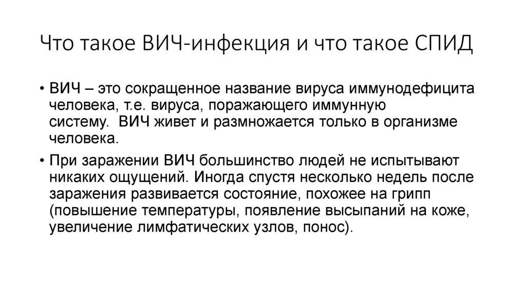 Что такое ВИЧ-инфекция и что такое СПИД• ВИЧ – это сокращенное название вируса иммунодефицита