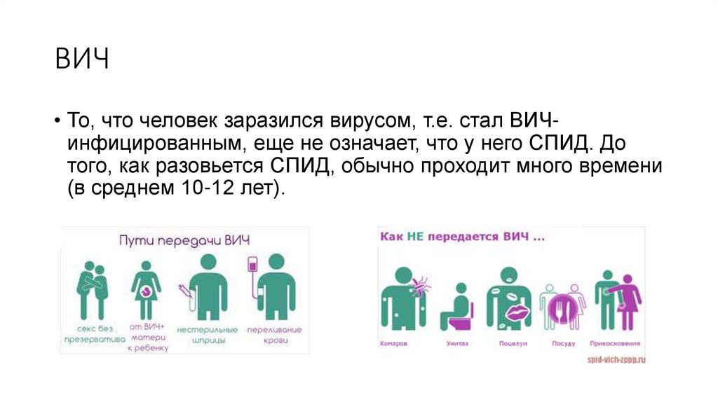 ВИЧ• То, что человек заразился вирусом, т.е. стал ВИЧинфицированным, еще не означает, что у него СПИД. До
