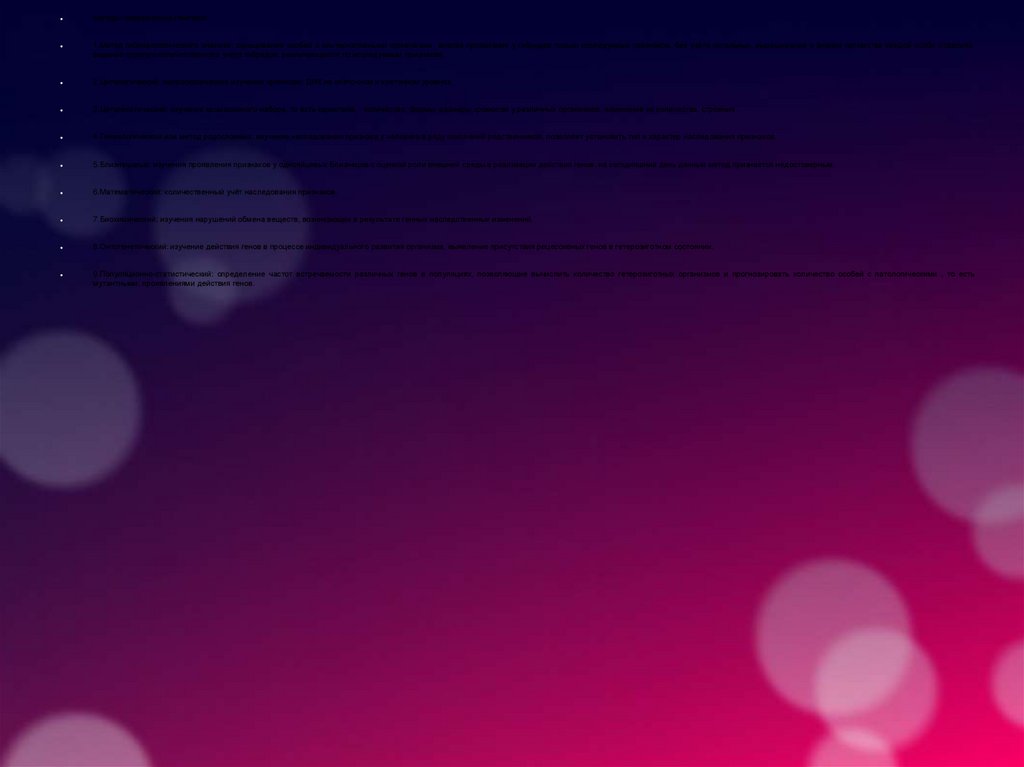 8.Онтогенетический: изучение действия генов в процессе индивидуального развития организма, выявление присутствия рецессивных генов в гетерозиготном состоянии.