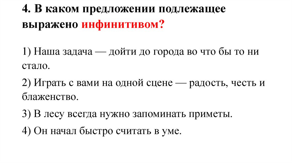 4. В каком предложении подлежащеевыражено инфинитивом?