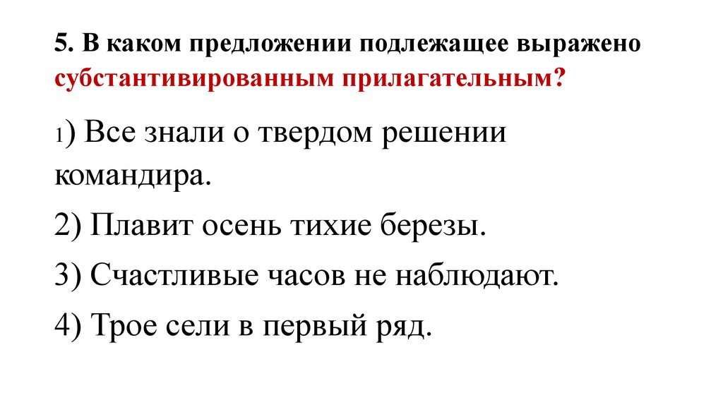 5. В каком предложении подлежащее выраженосубстантивированным прилагательным?