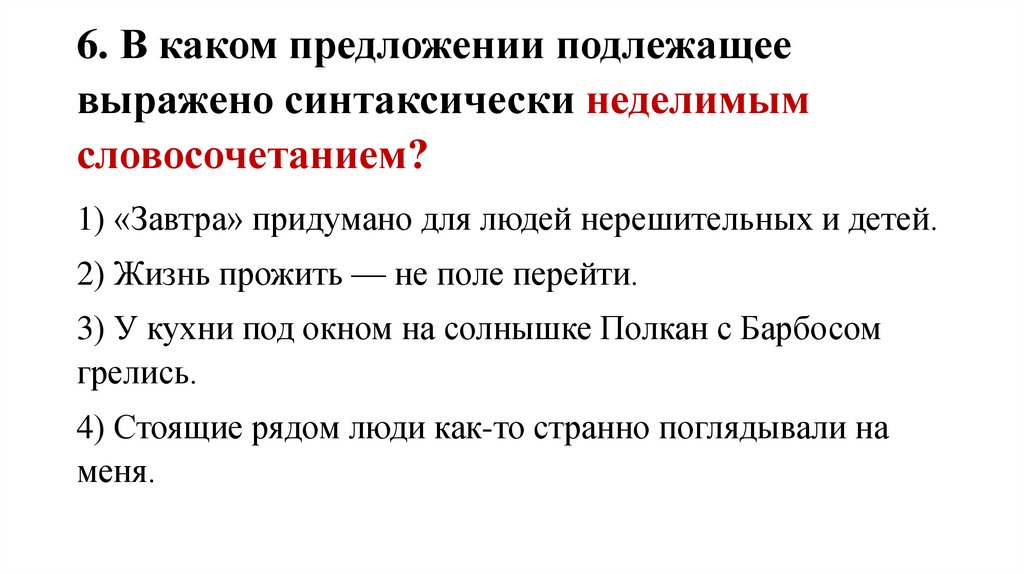 6. В каком предложении подлежащеевыражено синтаксически неделимым