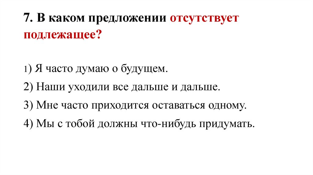 7. В каком предложении отсутствуетподлежащее?