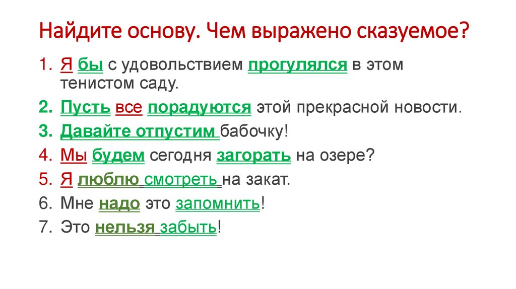 Найдите основу. Чем выражено сказуемое?1. Я бы с удовольствием прогулялся в этом