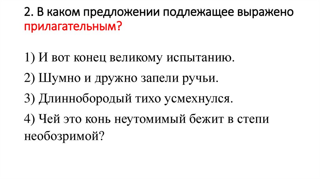 2. В каком предложении подлежащее выраженоприлагательным?