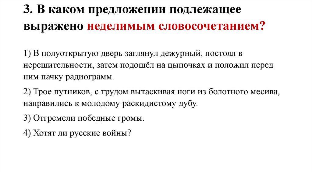 3. В каком предложении подлежащеевыражено неделимым словосочетанием?