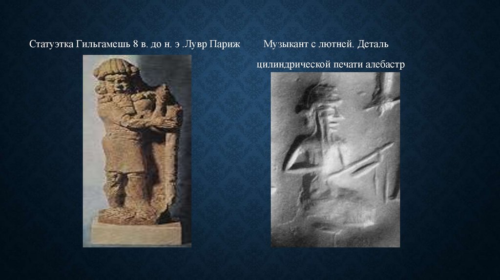 Статуэтка Гильгамешь 8 в. до н. э .Лувр ПарижМузыкант с лютней. Деталь