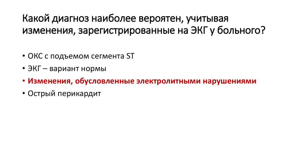 Какой диагноз наиболее вероятен, учитываяизменения, зарегистрированные на ЭКГ у больного?
