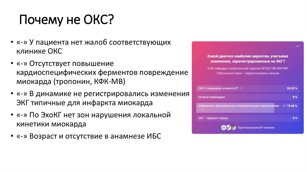 Почему не ОКС?• «-» У пациента нет жалоб соответствующих