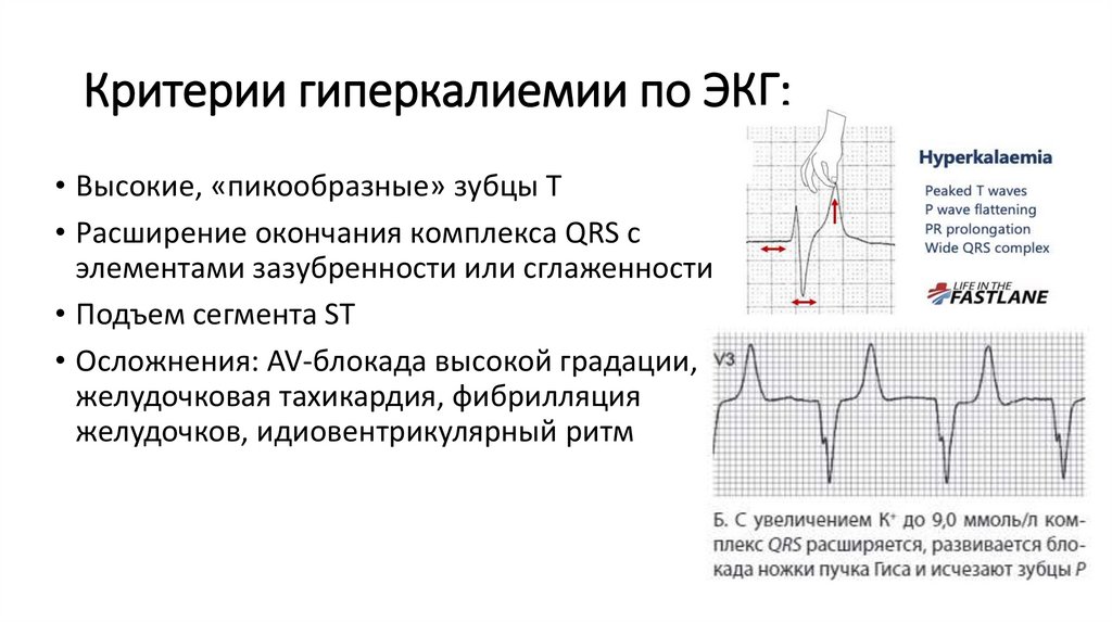 Критерии гиперкалиемии по ЭКГ:• Высокие, «пикообразные» зубцы Т