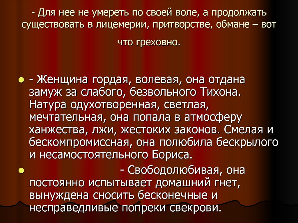 - Для нее не умереть по своей воле, а продолжатьсуществовать в лицемерии, притворстве, обмане – вот