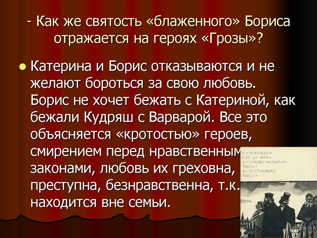 - Как же святость «блаженного» Борисаотражается на героях «Грозы»?
