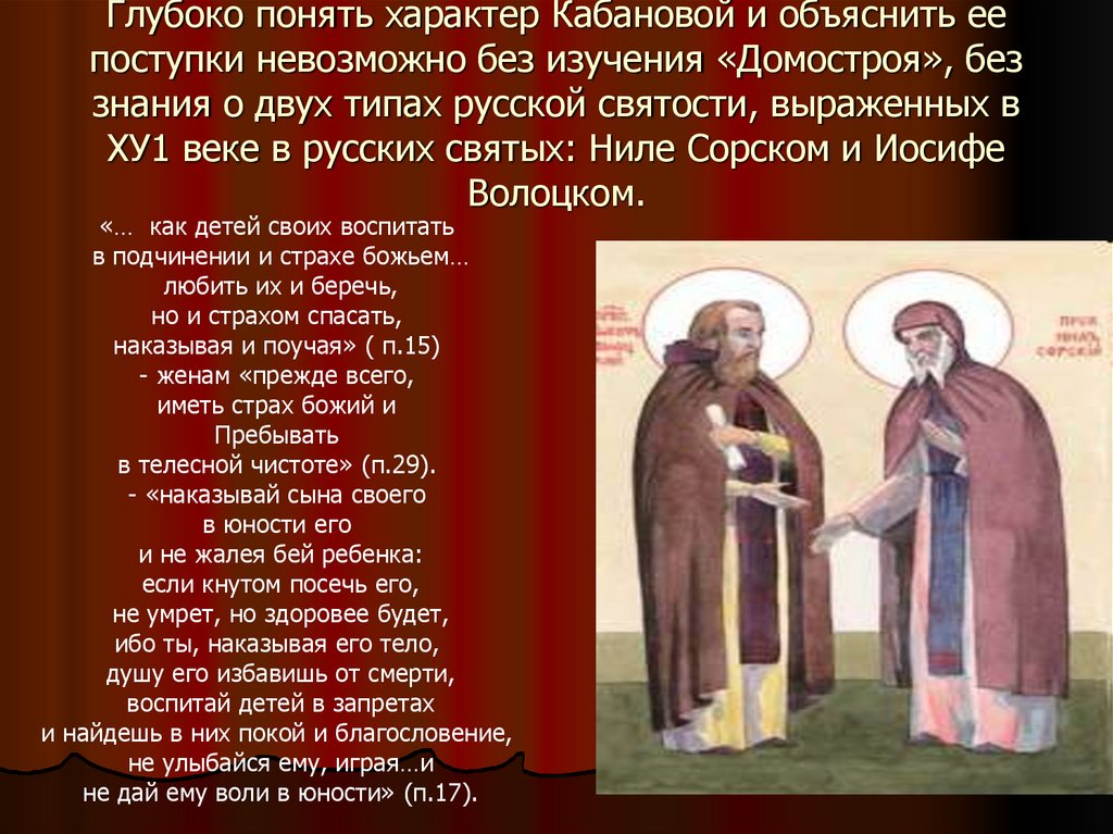 Глубоко понять характер Кабановой и объяснить еепоступки невозможно без изучения «Домостроя», без