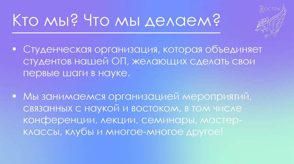 Кто мы? Что мы делаем?Студенческая организация, которая объединяет