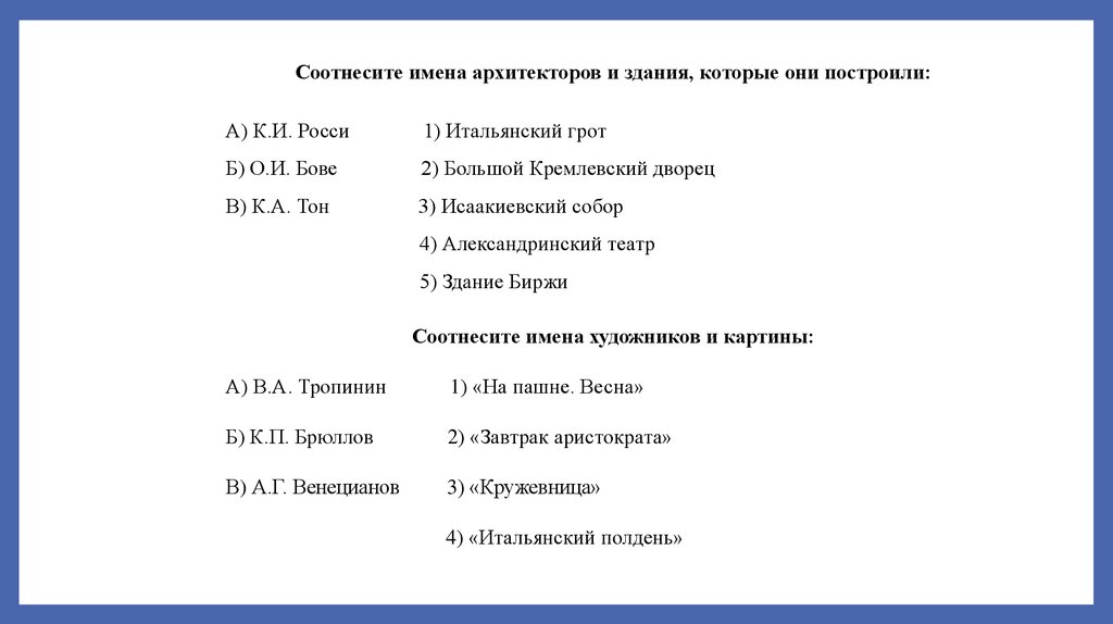 Соотнесите имена архитекторов и здания, которые они построили:А) К.И. Росси