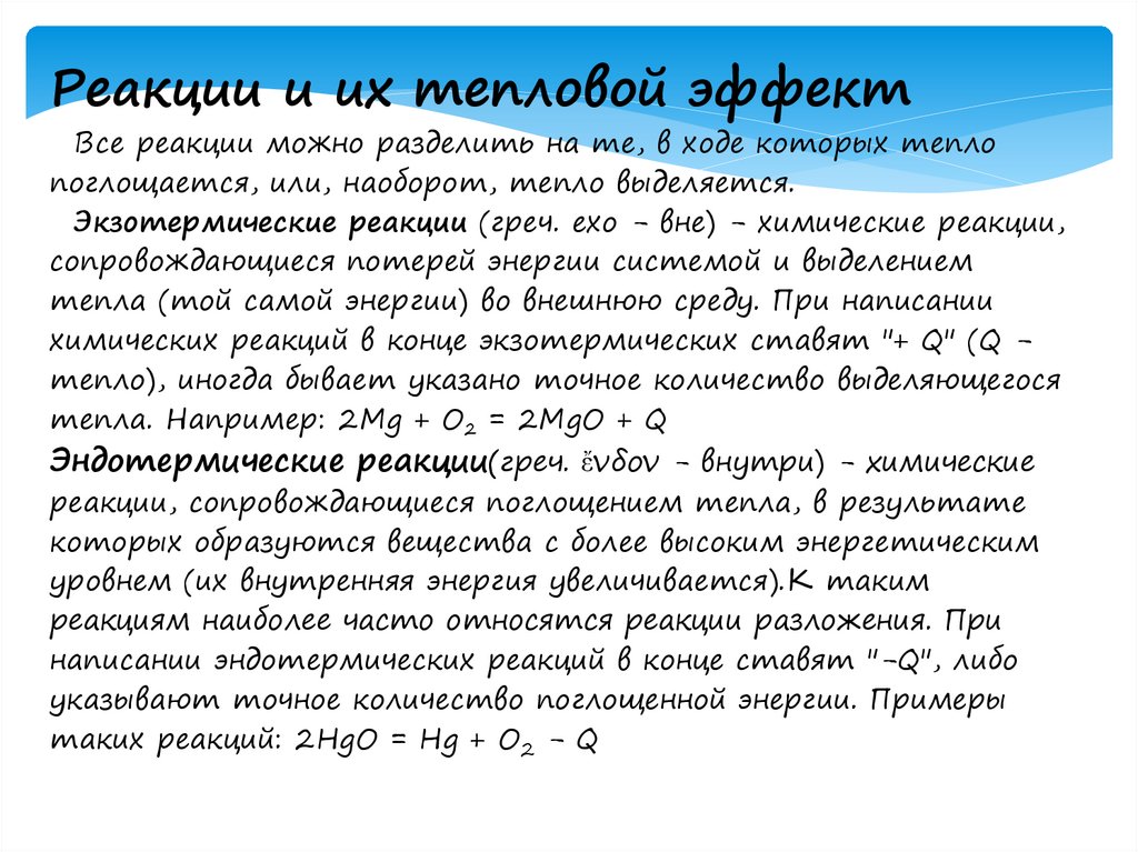 Реакции и их тепловой эффектВсе реакции можно разделить на те, в ходе которых тепло