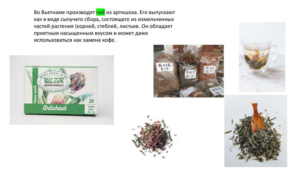 Во Вьетнаме производят чай из артишока. Его выпускаюткак в виде сыпучего сбора, состоящего из измельченных