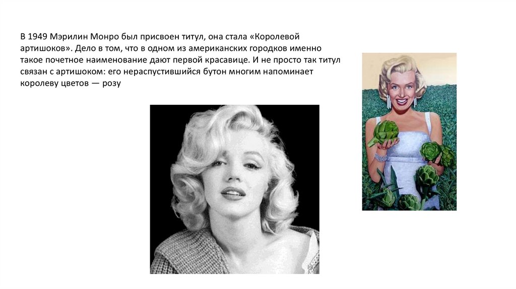 В 1949 Мэрилин Монро был присвоен титул, она стала «Королевойартишоков». Дело в том, что в одном из американских городков именно
