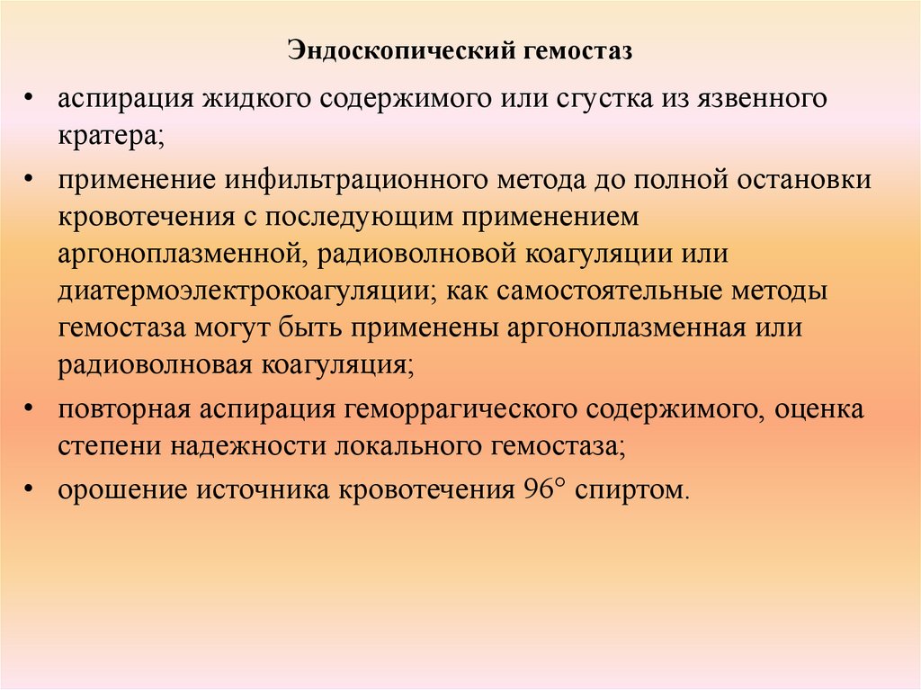 Эндоскопический гемостаз• аспирация жидкого содержимого или сгустка из язвенного