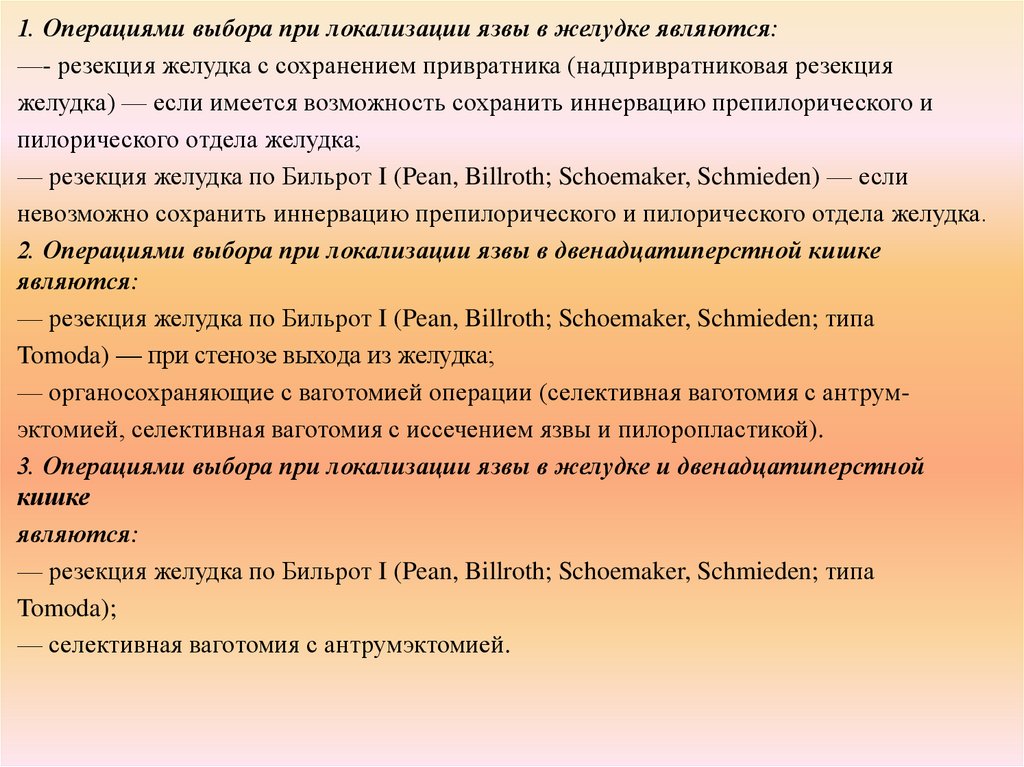 1. Операциями выбора при локализации язвы в желудке являются:—- резекция желудка с сохранением привратника (надпривратниковая резекция
