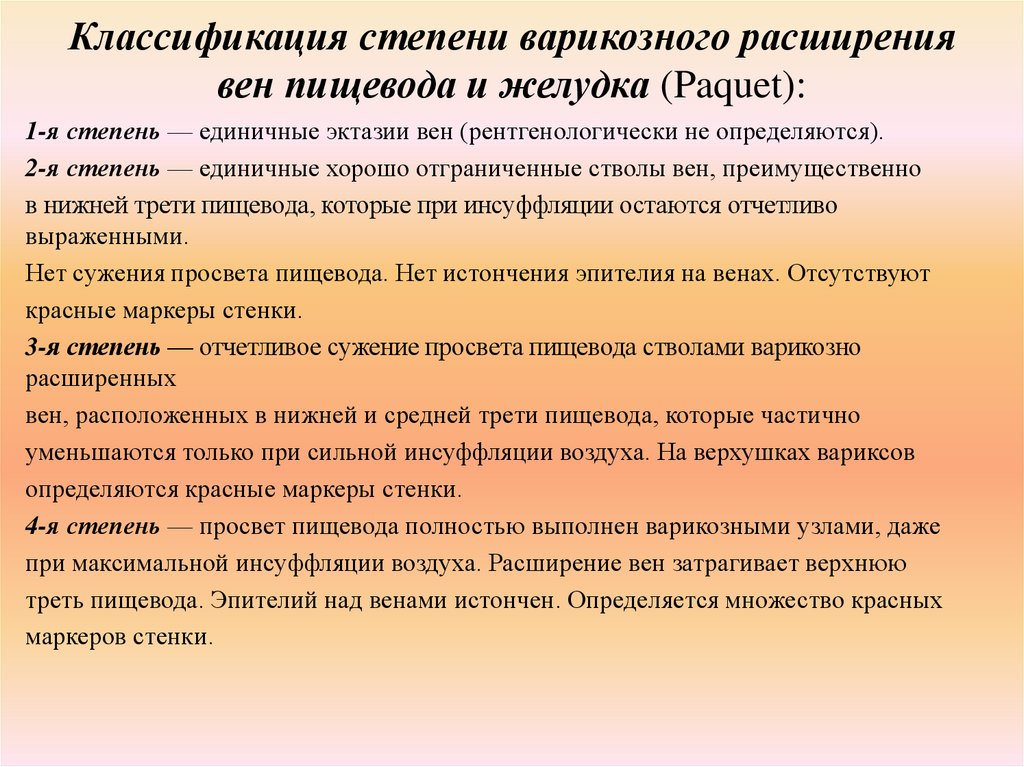 Классификация степени варикозного расширениявен пищевода и желудка (Paquet):