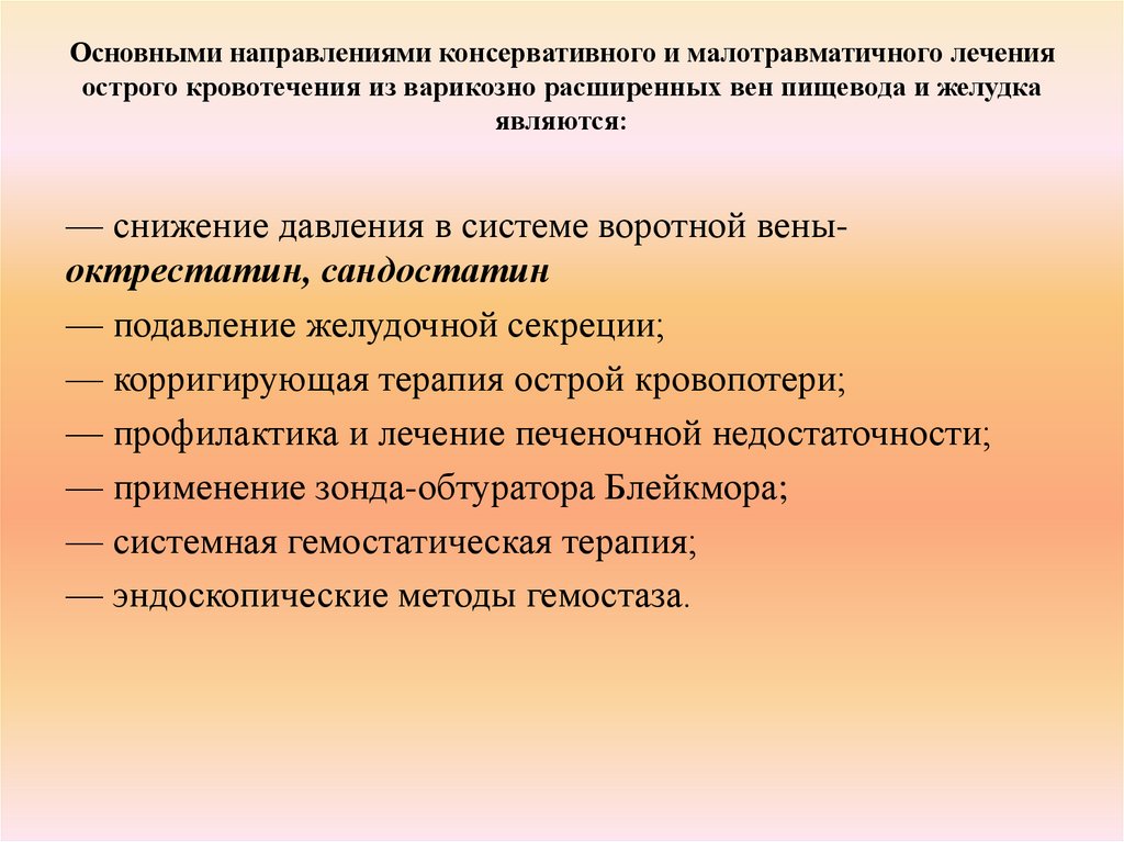 Основными направлениями консервативного и малотравматичного леченияострого кровотечения из варикозно расширенных вен пищевода и желудка