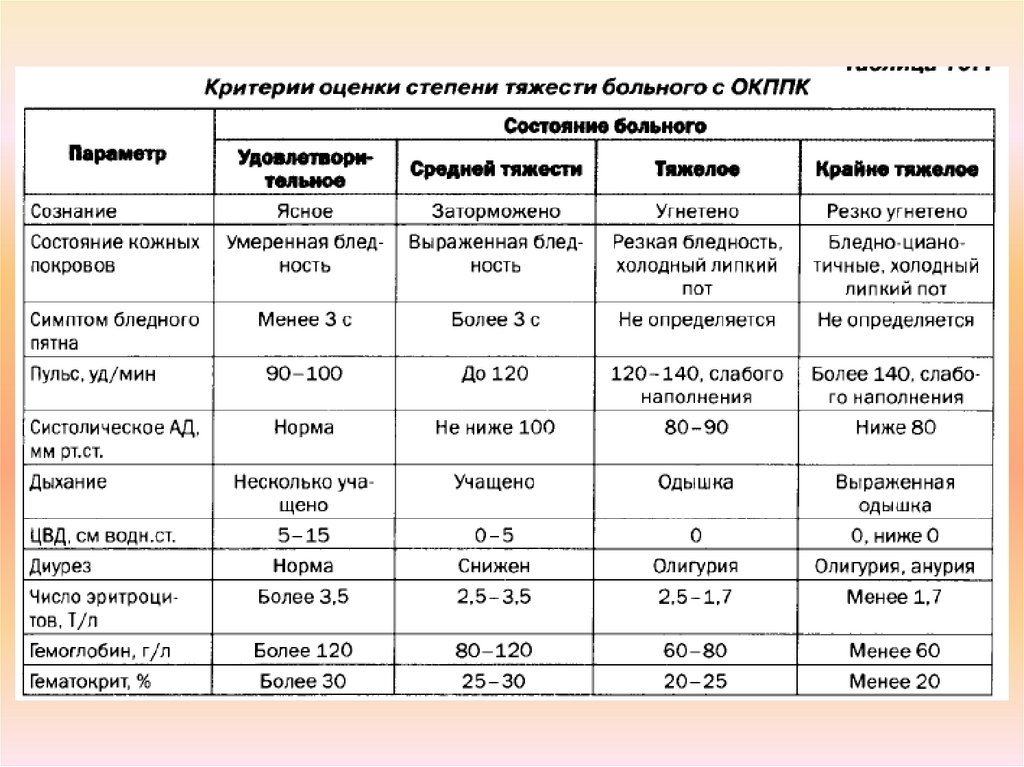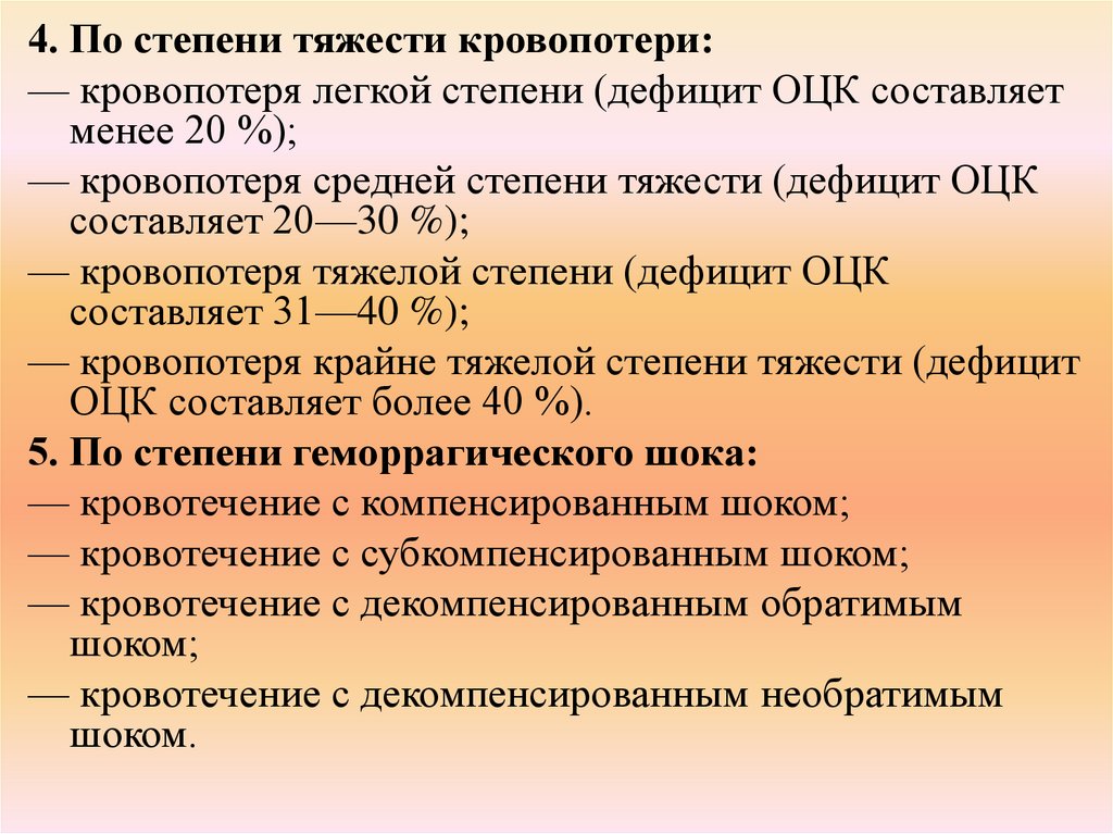 4. По степени тяжести кровопотери:— кровопотеря легкой степени (дефицит ОЦК составляет
