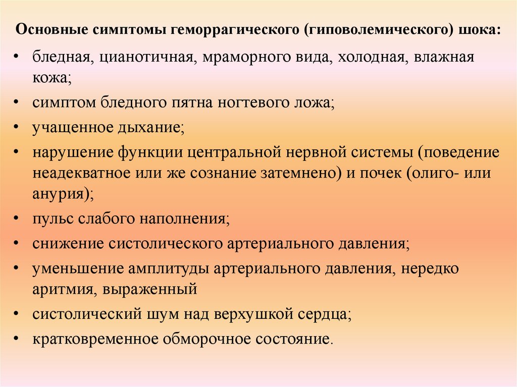 Основные симптомы геморрагического (гиповолемического) шока:• бледная, цианотичная, мраморного вида, холодная, влажная