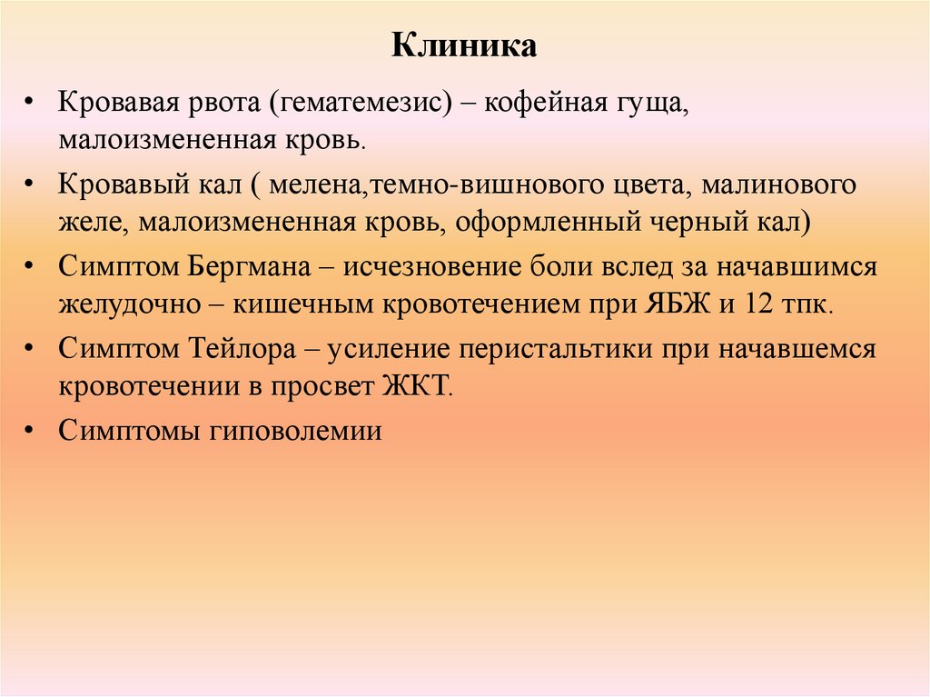 Клиника• Кровавая рвота (гематемезис) – кофейная гуща,