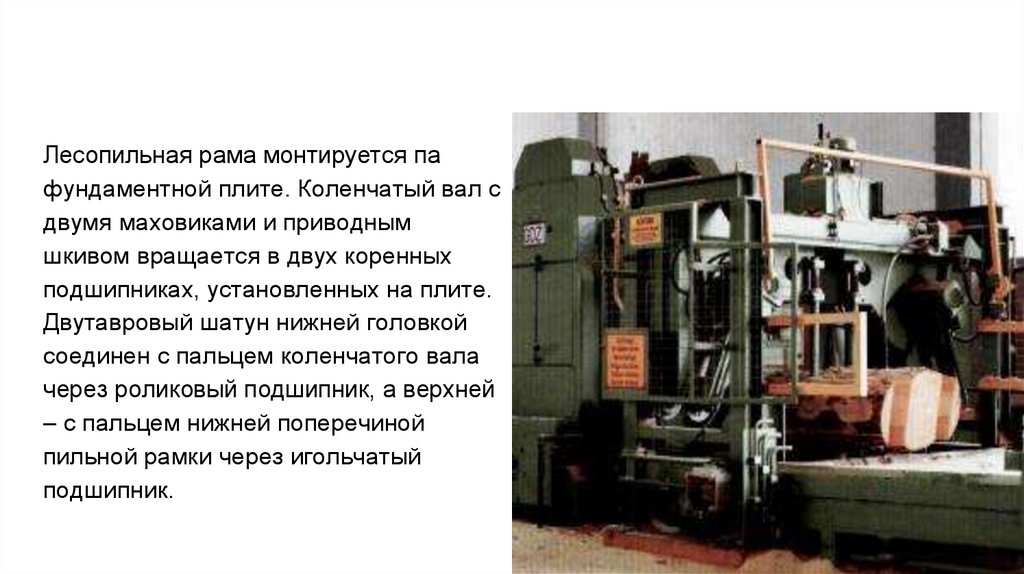 Лесопильная рама монтируется пафундаментной плите. Коленчатый вал с