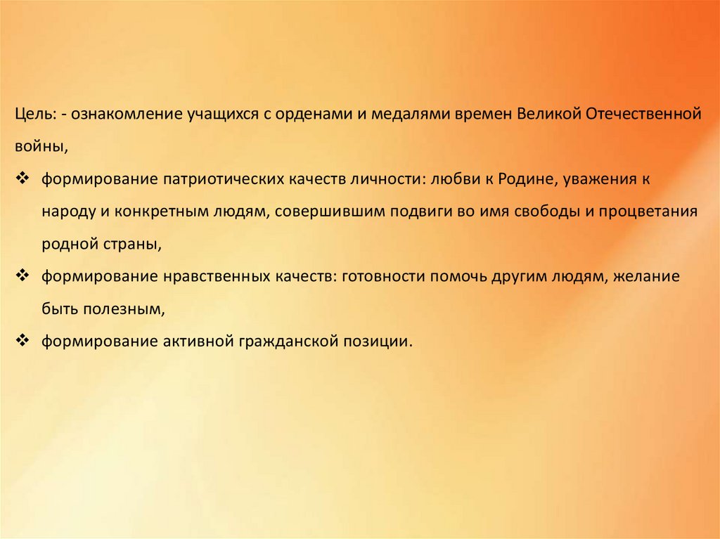 Цель: - ознакомление учащихся с орденами и медалями времен Великой Отечественнойвойны,