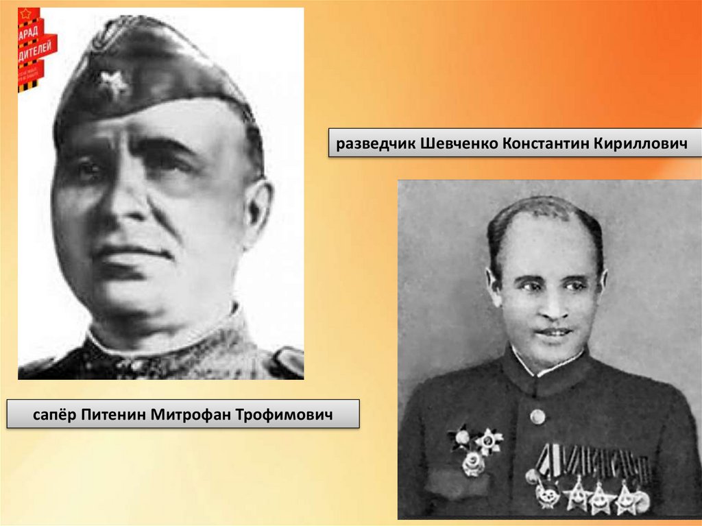 разведчик Шевченко Константин Кирилловичсапёр Питенин Митрофан Трофимович