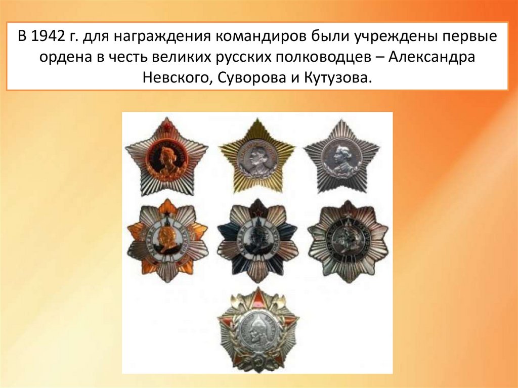 В 1942 г. для награждения командиров были учреждены первыеордена в честь великих русских полководцев – Александра