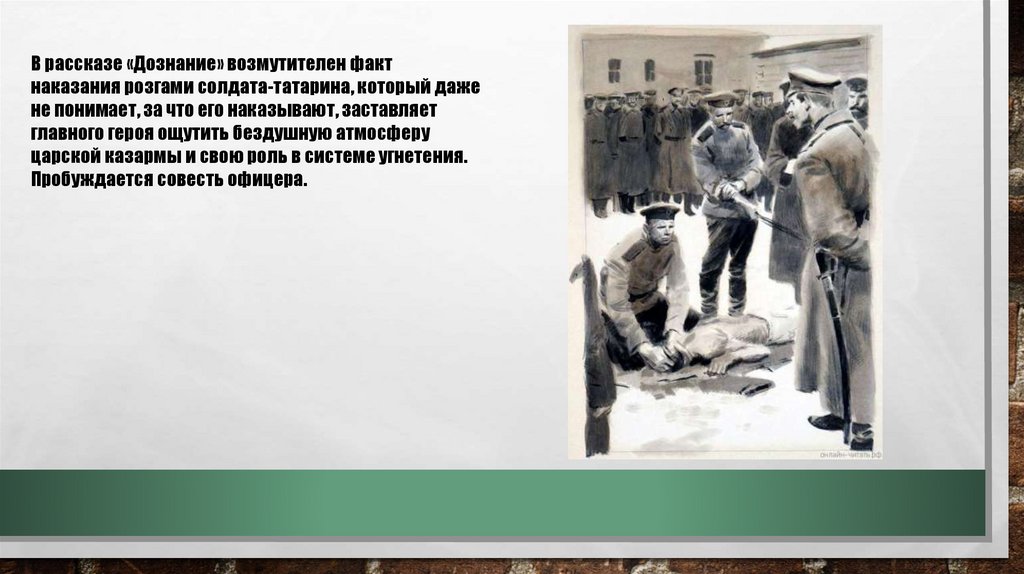 В рассказе «Дознание» возмутителен фактнаказания розгами солдата-татарина, который даже