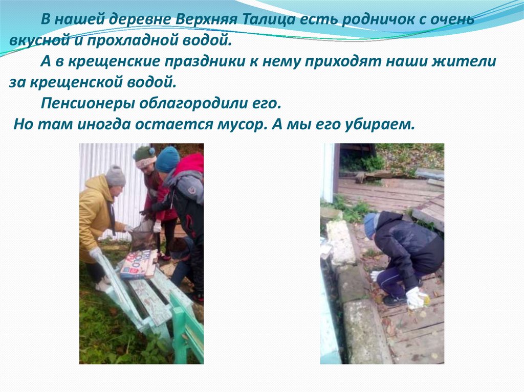 В нашей деревне Верхняя Талица есть родничок с оченьвкусной и прохладной водой.