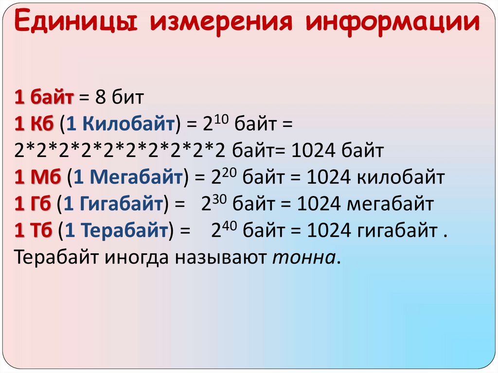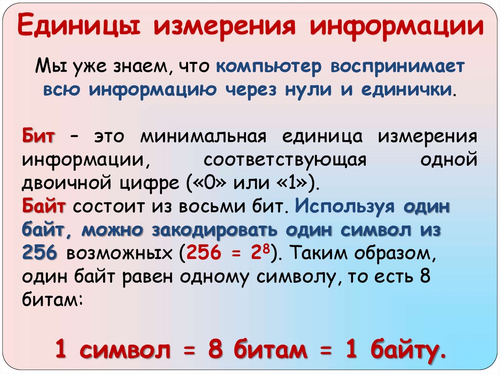 Единицы измерения информации1 байт = 8 бит