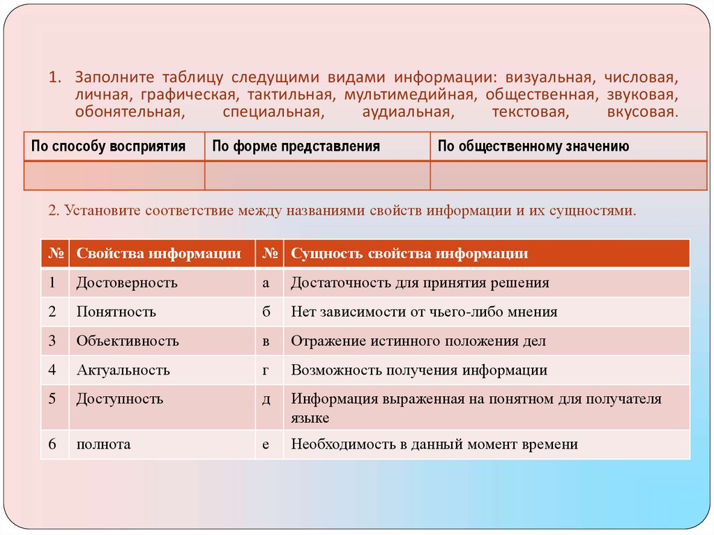 1. Заполните таблицу следущими видами информации: визуальная, числовая,личная, графическая, тактильная, мультимедийная, общественная, звуковая,