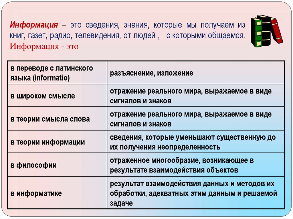 Информация – это сведения, знания, которые мы получаем изкниг, газет, радио, телевидения, от людей , с которыми общаемся.