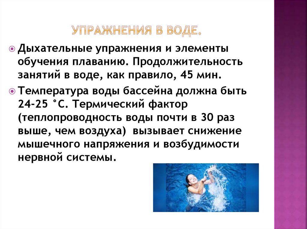 занятий в воде, как правило, 45 мин.