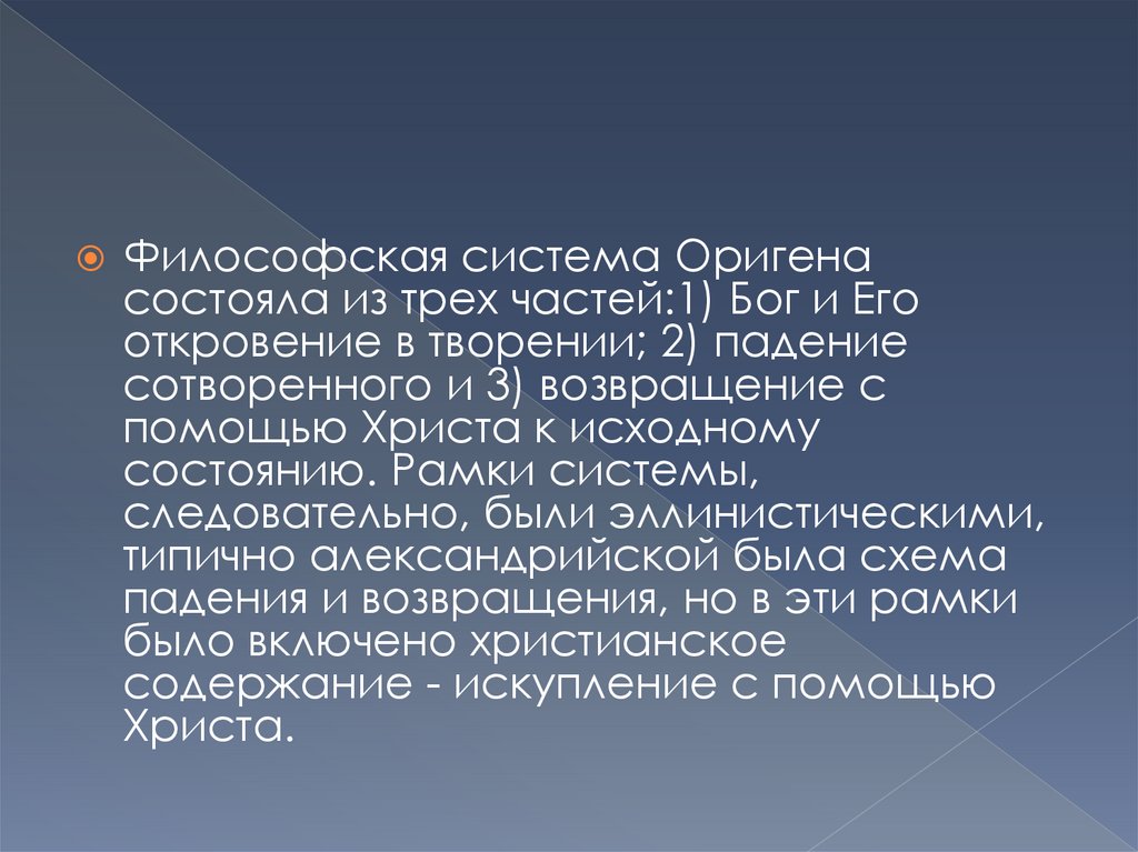 Философская система Оригенасостояла из трех частей:1) Бог и Его