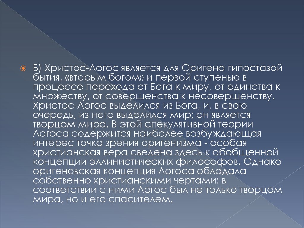 Б) Христос-Логос является для Оригена гипостазойбытия, «вторым богом» и первой ступенью в