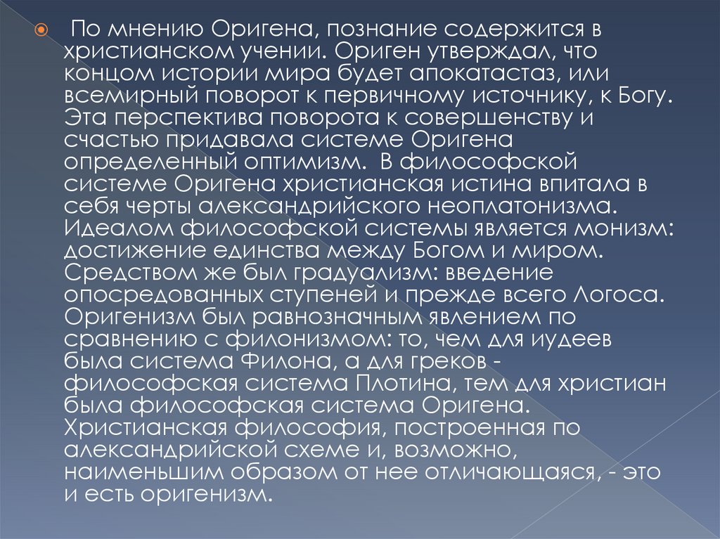 По мнению Оригена, познание содержится вхристианском учении. Ориген утверждал, что